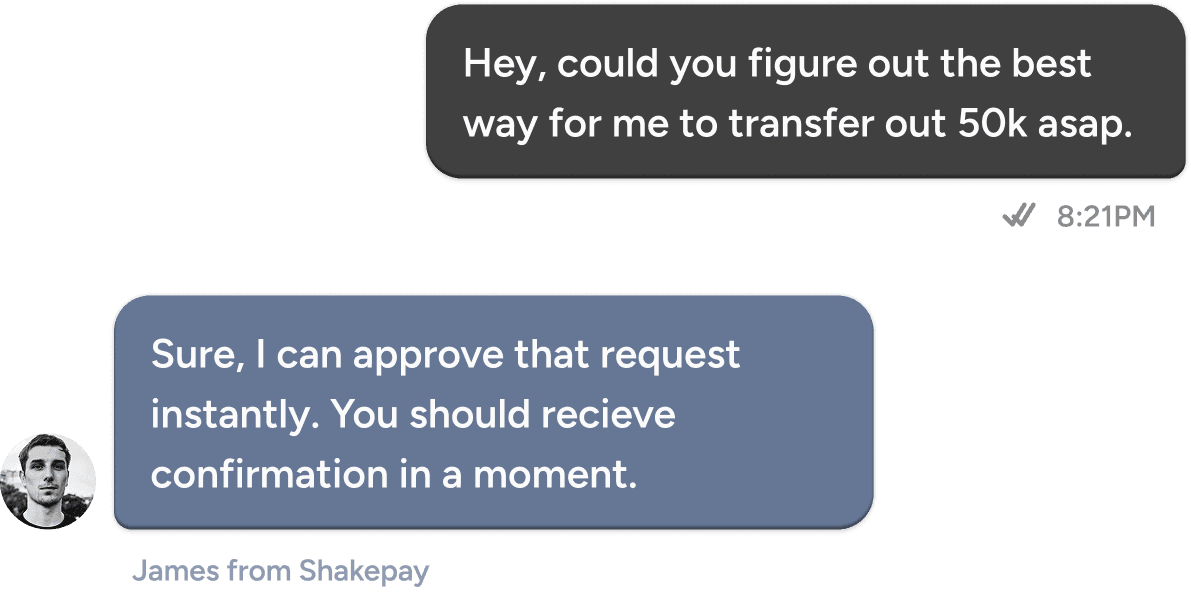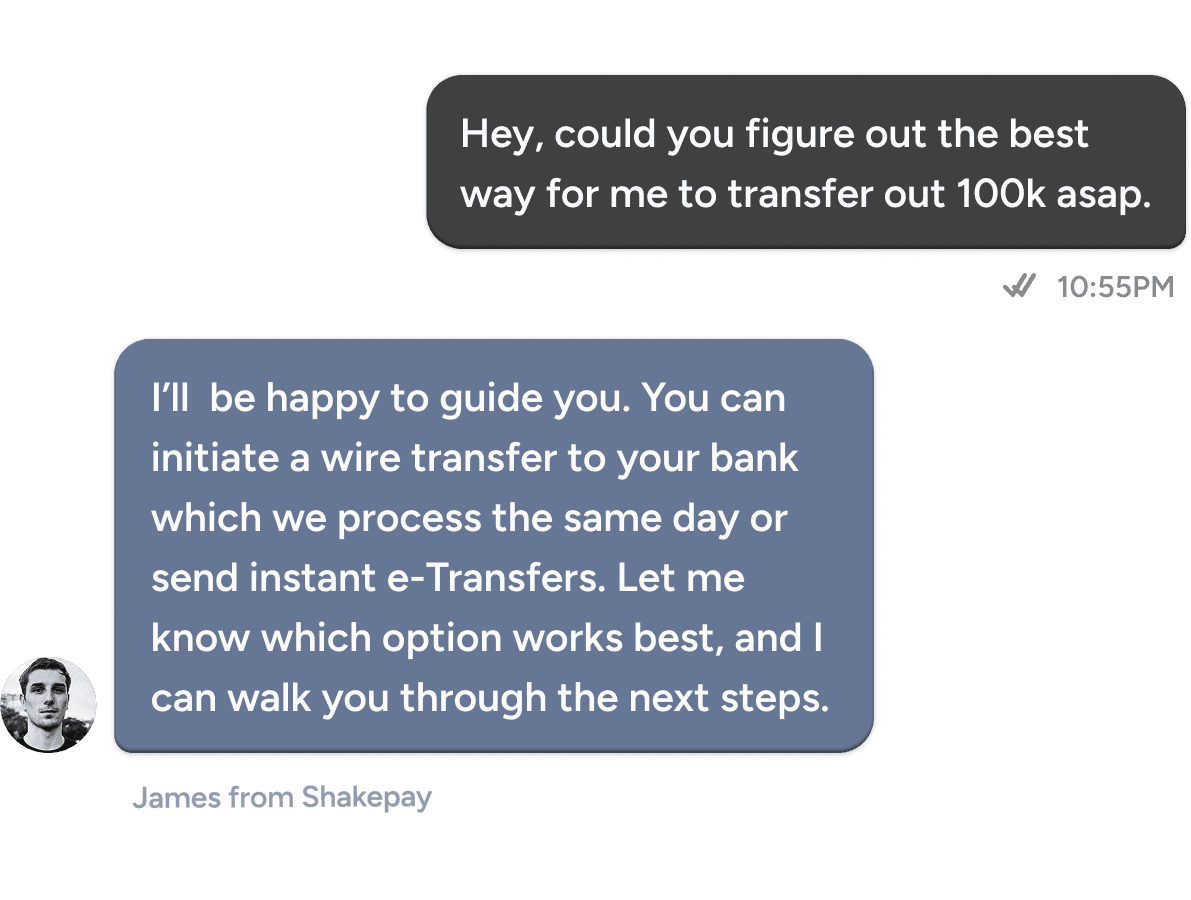 Get a dedicated account manager to help you onboard, execute trades, and get the most out of your Shakepay experience.